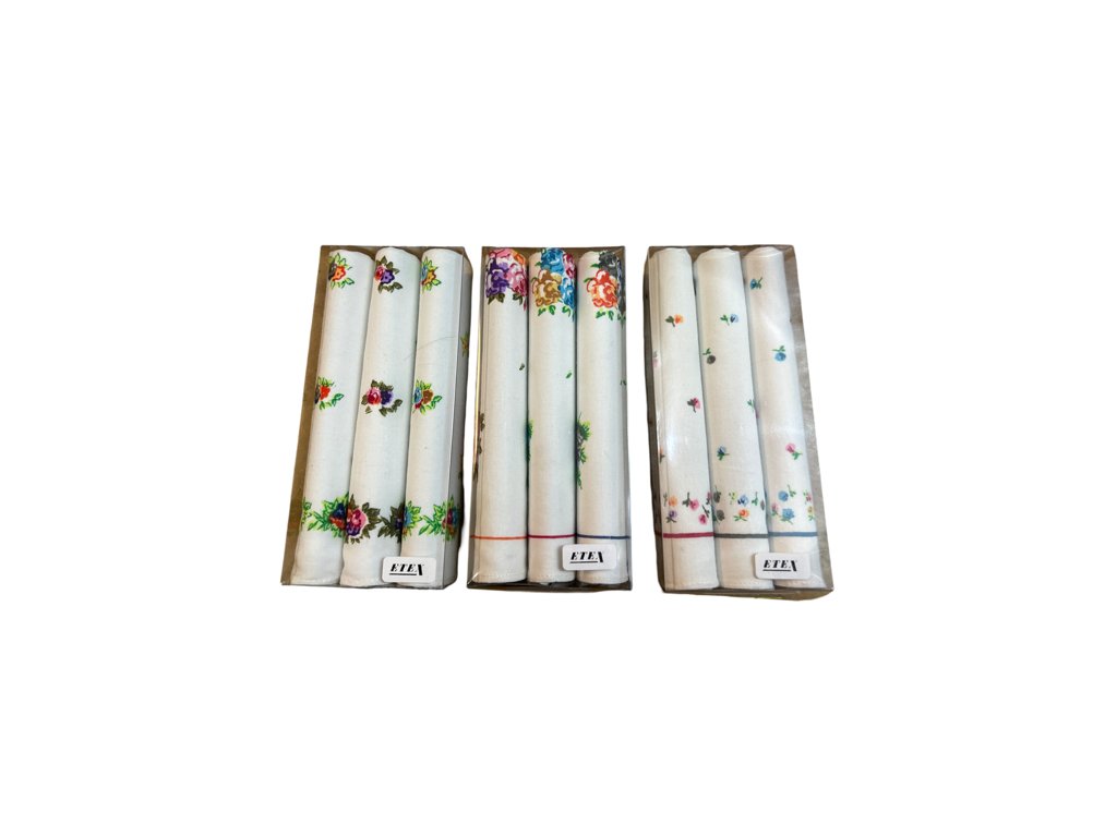 Dámský kapesník v dárkové krabičce s decentními kytičky. Baleno po 3 kusech. Český výrobce fa. ETEX - Hořice,100% bavlna.