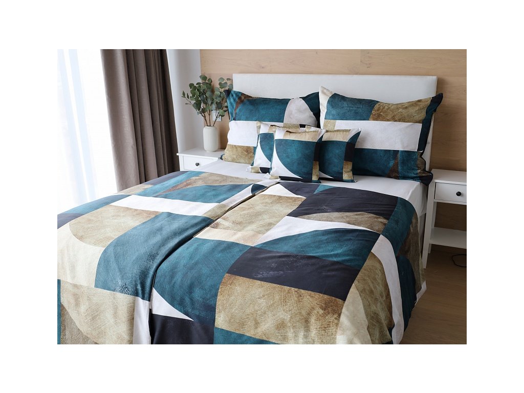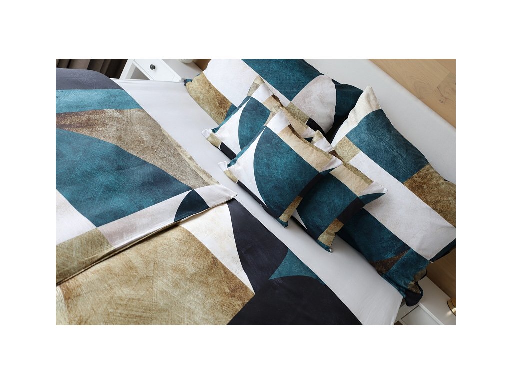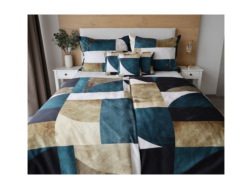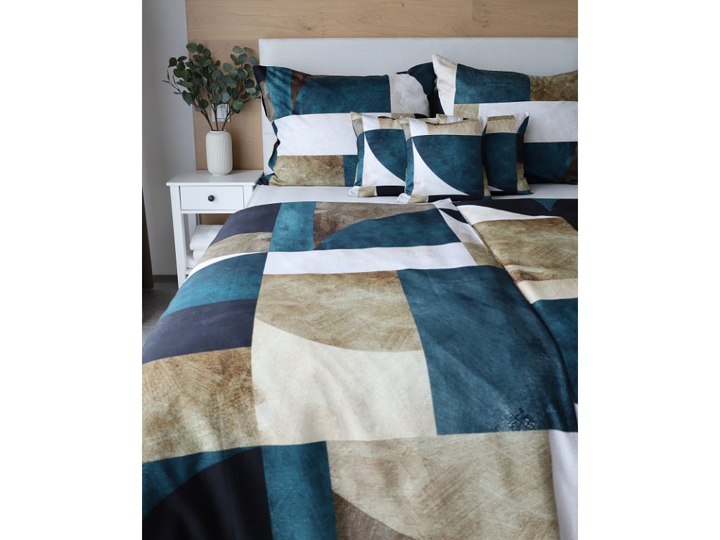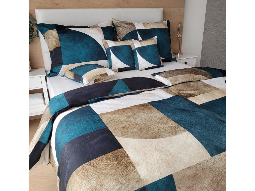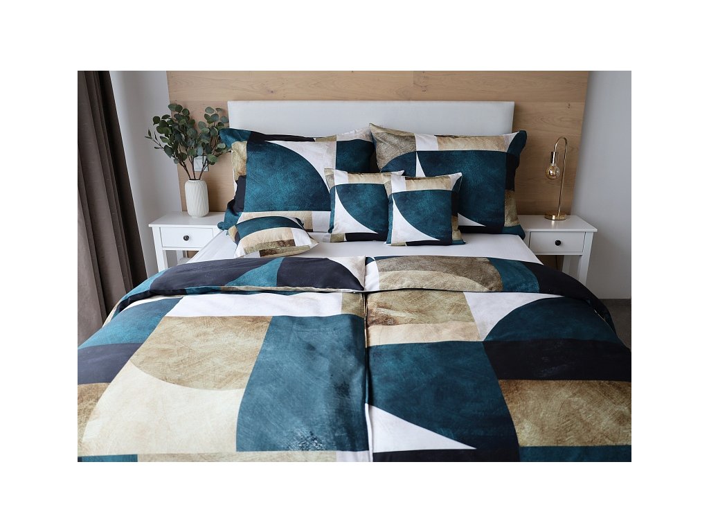 Potřebujete vyladit moderní ložnici k dokonalosti? Vsaďte na ložní povlečení Enzo. Abstraktní geometrický vzor kombinuje atraktivní odstíny zelenomodré, kávově hnědé a krémové. Struktura potisku nese typické prvky umělecké malby.