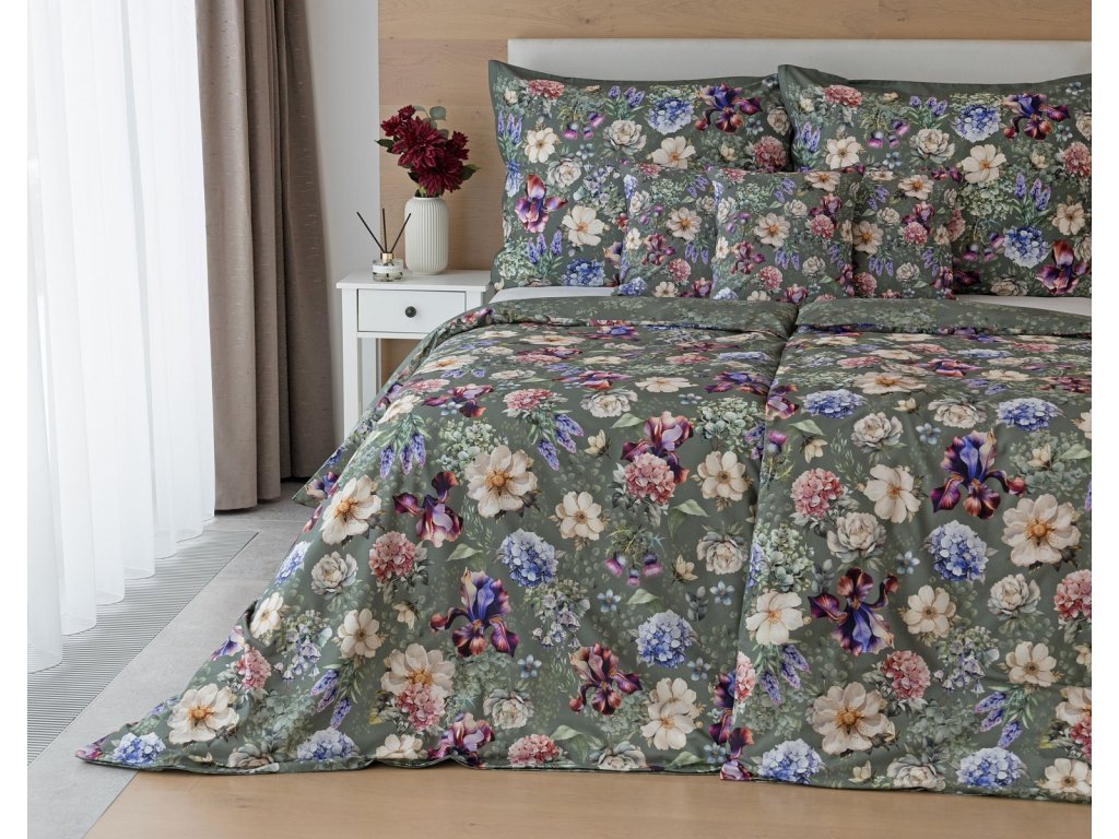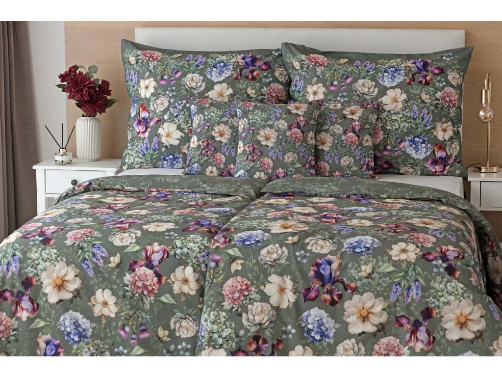 Pestrobarevnou květinovou symfonii rozehraje ve vaší ložnici bavlněné povlečení Jacqueline. Květy planých růží, hortenzií a kosatců se rozprostírají na zeleno-šedém podkladu. Vzor vyniká v precizním detailu tisku a díky oblíbenému oboustrannému provedení můžete při stlaní hravě experimentovat.