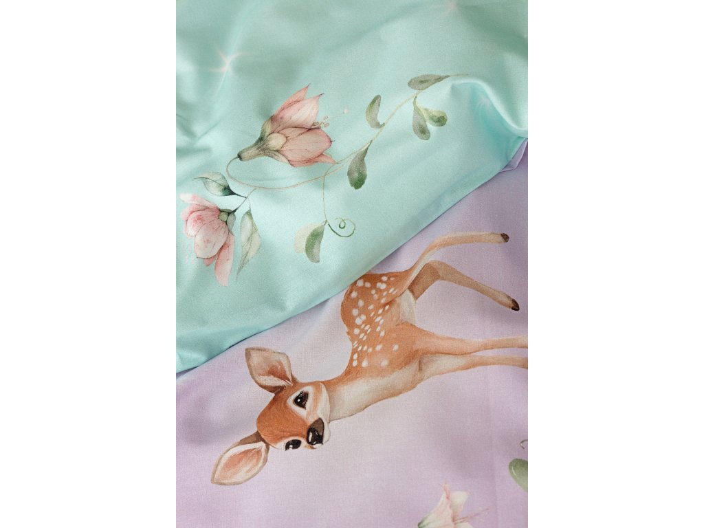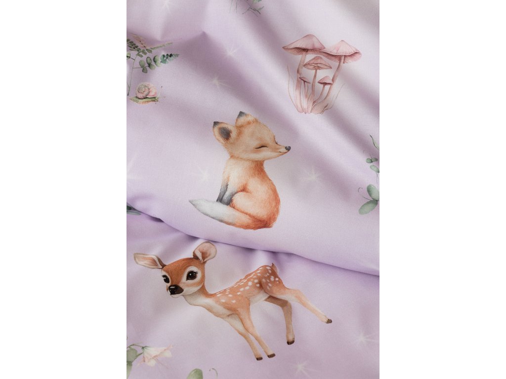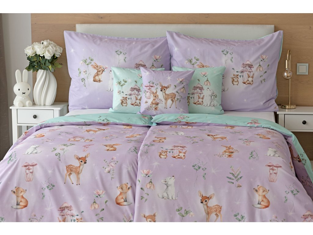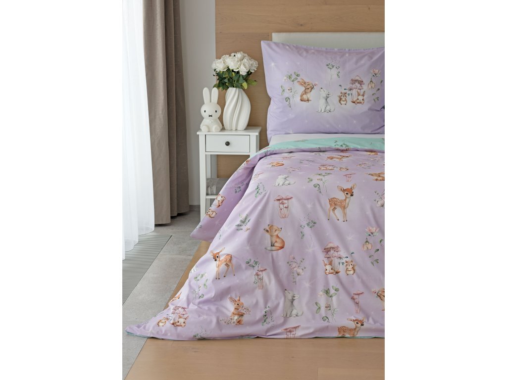 Vdechněte dětskému pokoji kouzelnou atmosféru pohádkového lesa, kde vládne klid, něha a fantazie. Okouzlující povlečení Lesní pohádka v pastelových tónech fialové a mentolové barvy je zdobeno roztomilými lesními zvířátky, která působí jako vystřižená z dětské knížky plné snů. Srnečci, zajíčci a další obyvatelé lesa vytvářejí harmonický a hravý motiv, který si děti okamžitě zamilují. O jejich spokojený spánek se postará hebká prvotřídní bavlna.