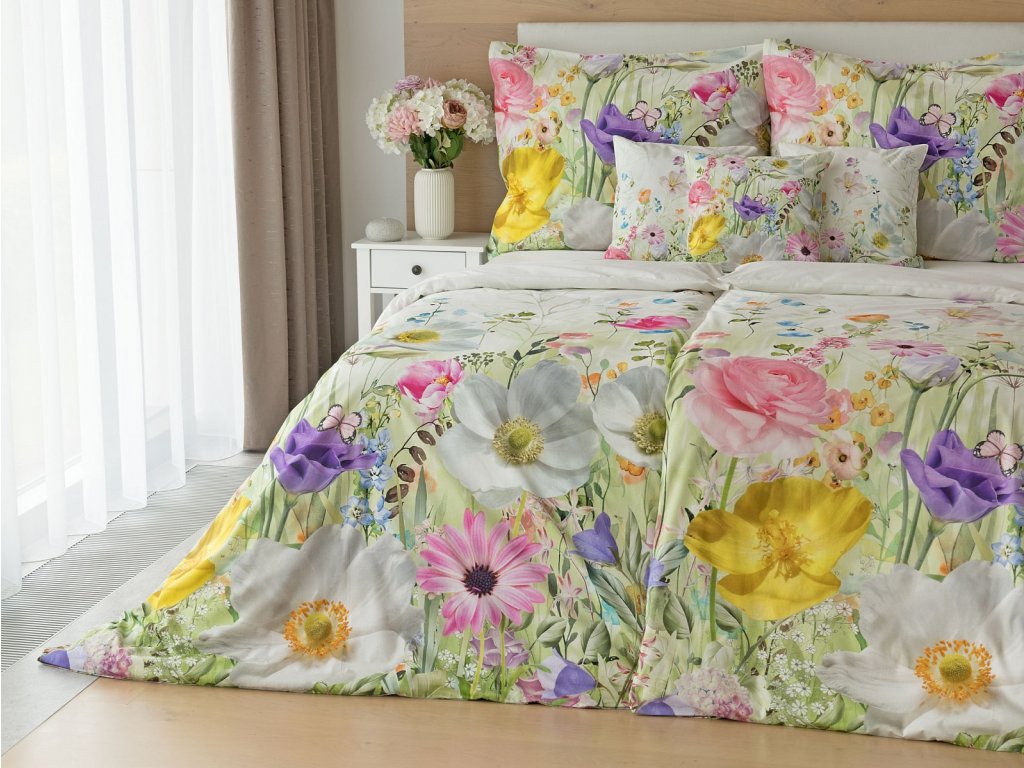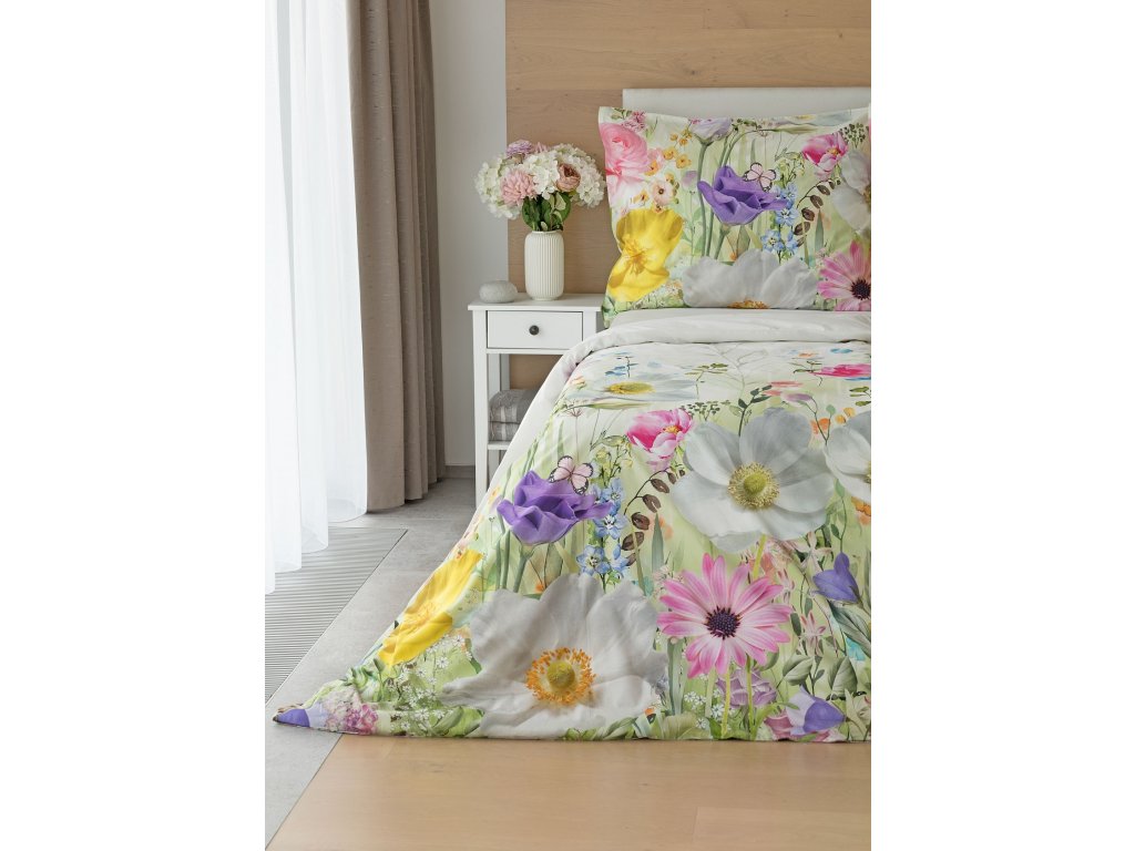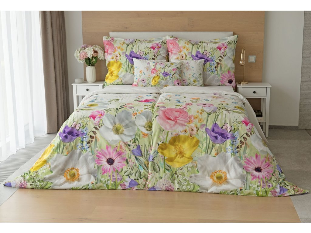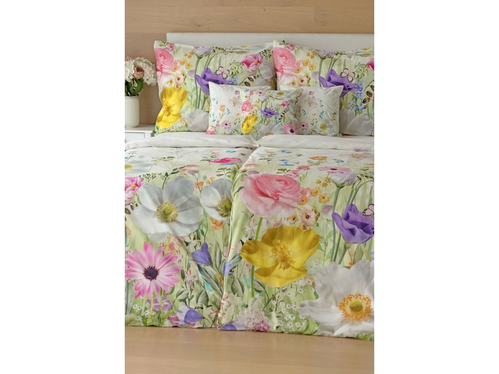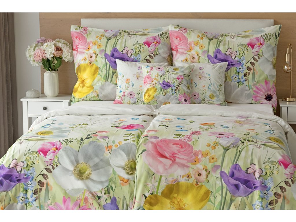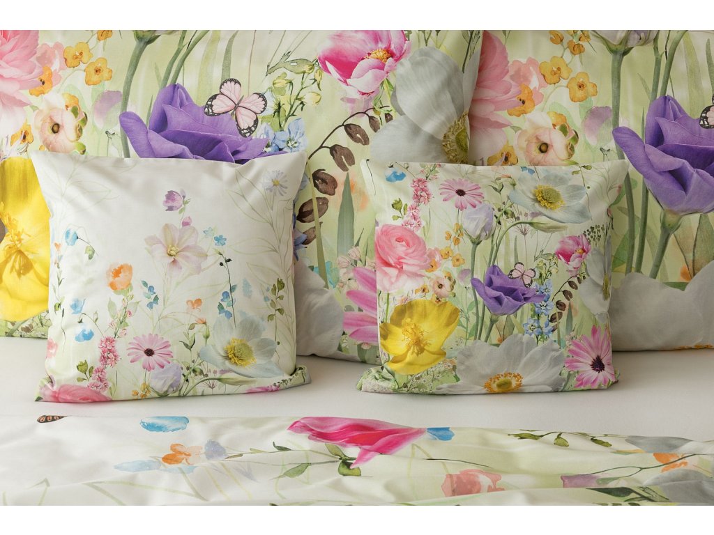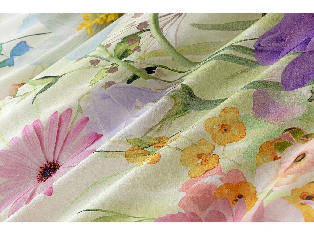 Povlak na přikrývku je z obou stran stejný. Povlak na polštář zachycuje z každé strany jinou část květinového vzoru. Spodní květinový motiv je pestřejší, vrchní strana odpovídá vyobrazení na fotografii a v pravém dolním rohu zdobí povlak malé logo "M". Povlečení je opatřeno komfortním zipovým uzávěrem..