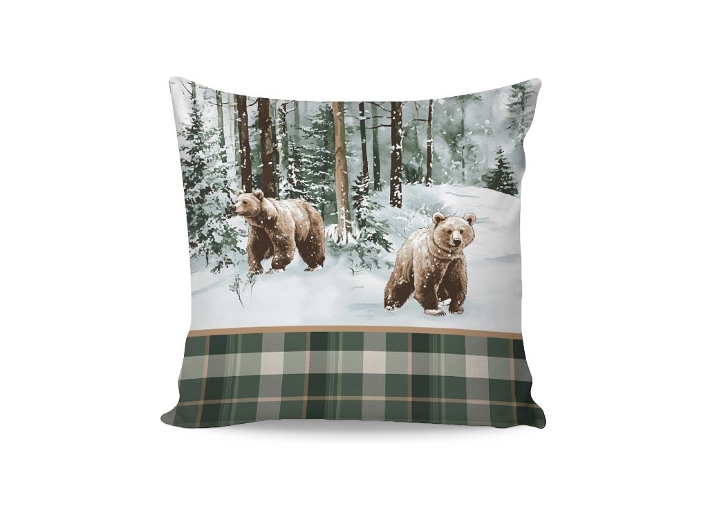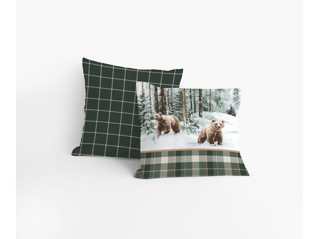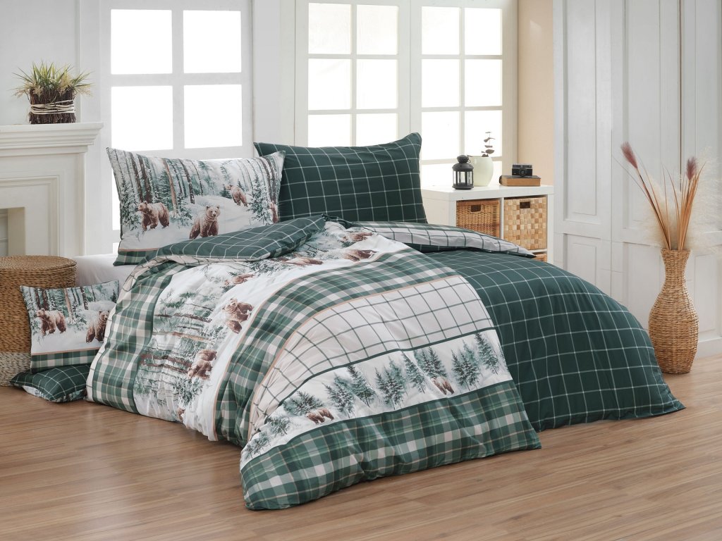 Povlak na polštář i na přikrývku zachycuje na vrchní straně motiv zimní krajiny s obrázky medvědů, spodní stranu povlečení zdobí kostkovaný vzor v bílé kontuře na tmavě zeleném podkladu. Povlečení je opatřeno komfortním zipovým uzávěrem.