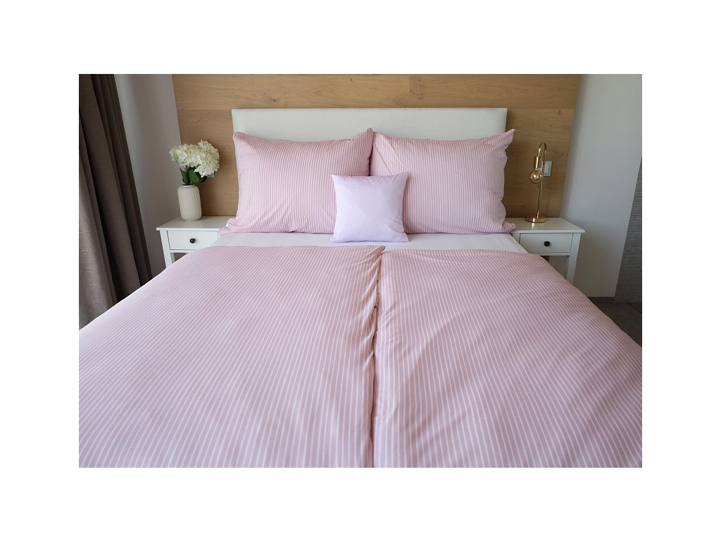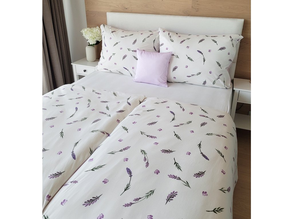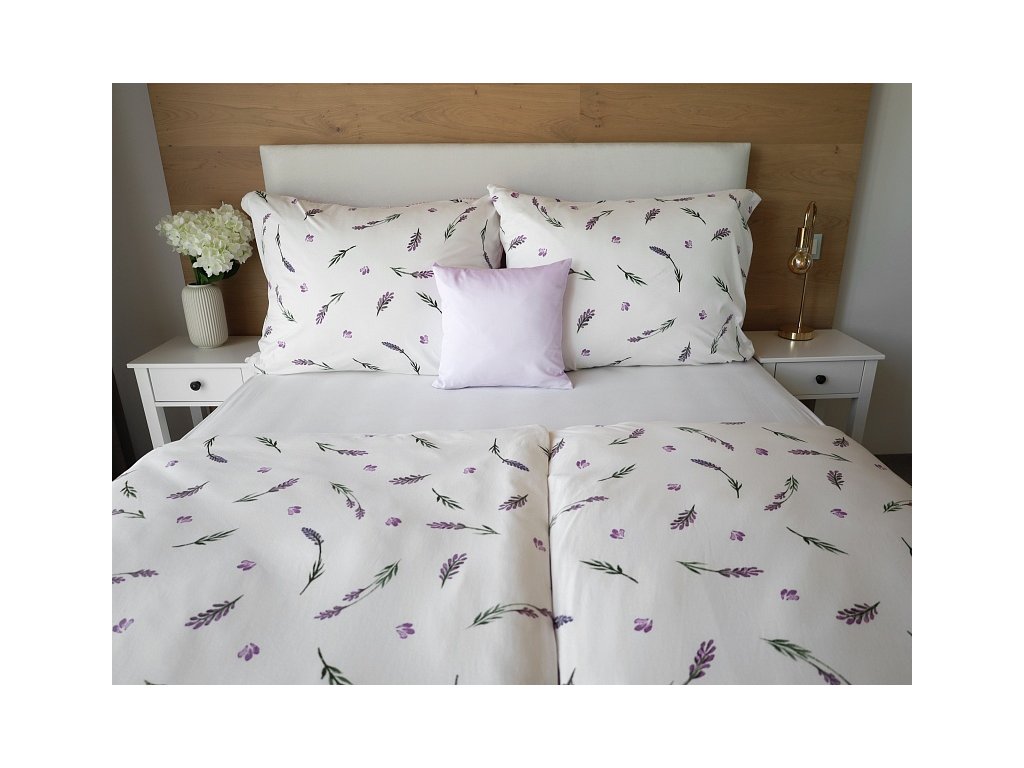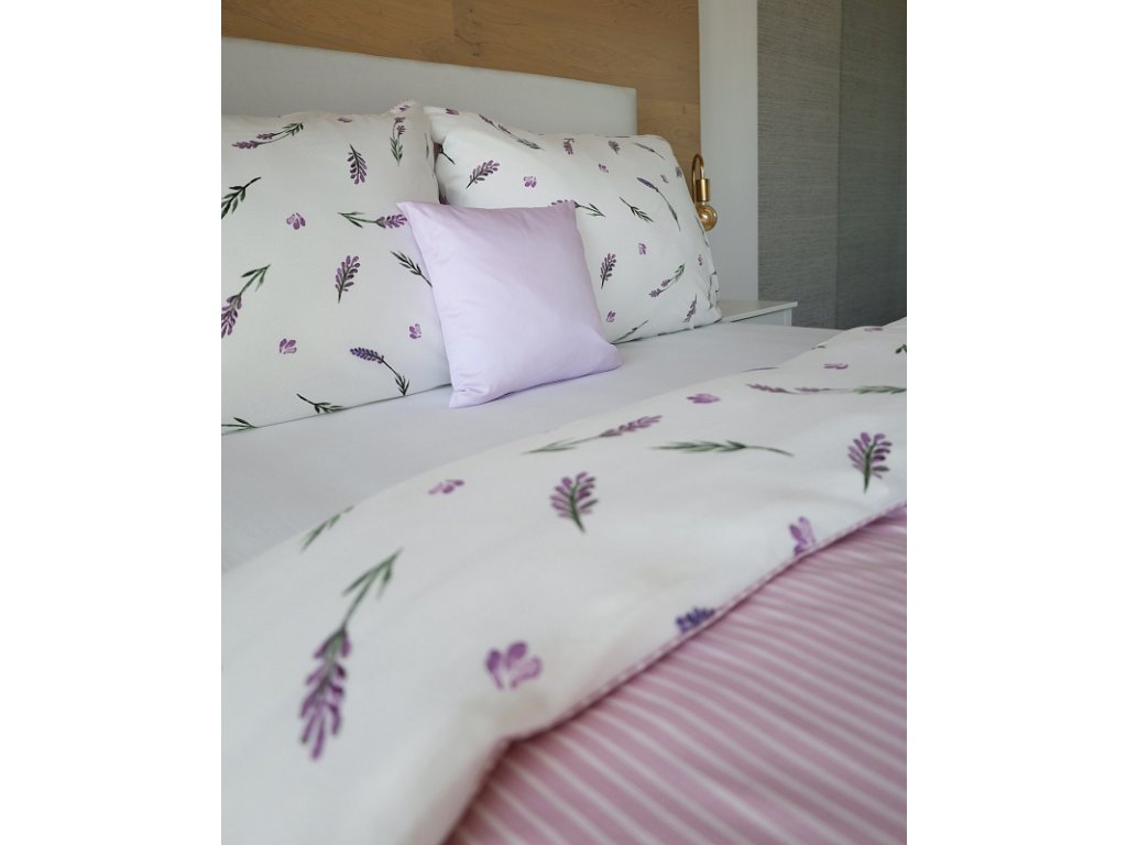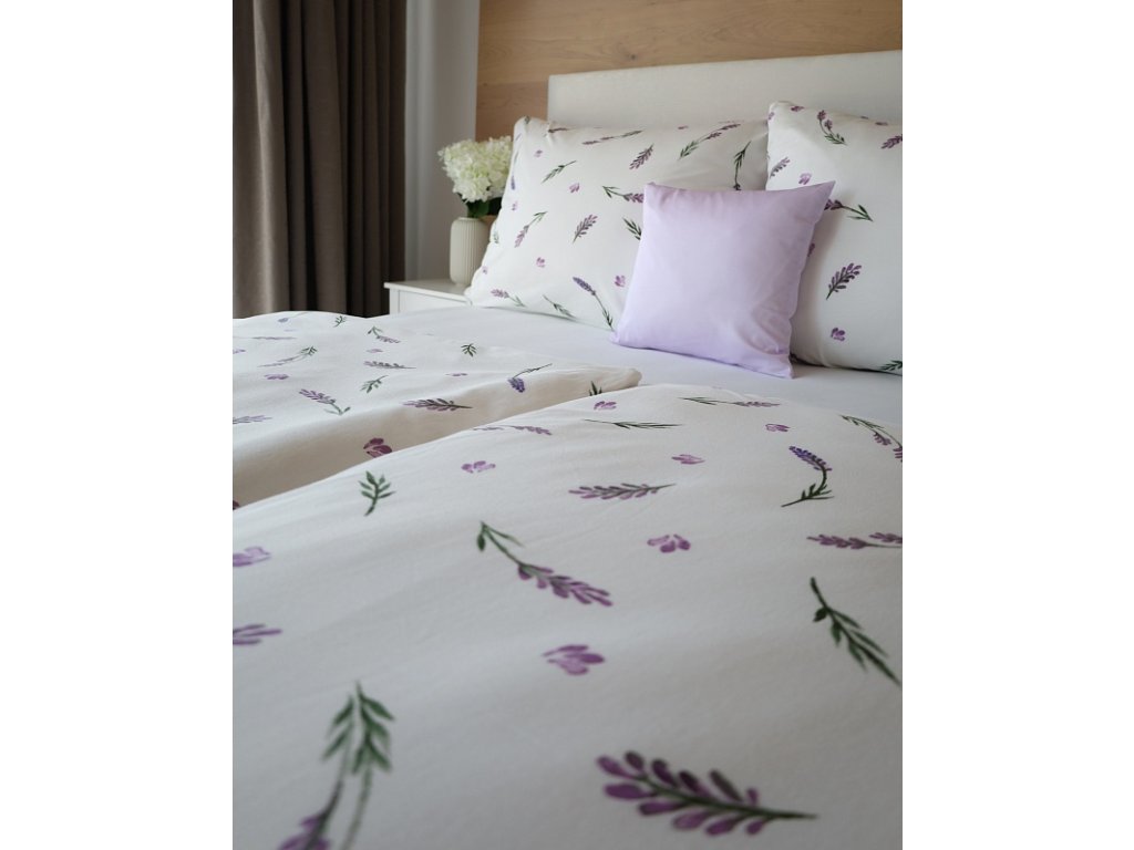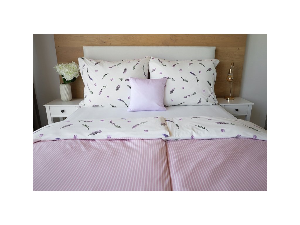 Oblíbený motiv levandule ve spojení s elegantním proužkem přináší ložní povlečení Lavender. Vrchní stranu povlečení zdobí levandulové snítky na bílém podkladu, spodní stranu tvoří pastelově růžový podklad protnutý jemnými bílými proužky.