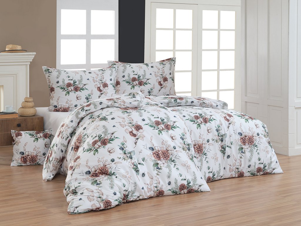 Saténové ložní povlečení Anabelle s decentním zimním dekorem navodí ve vaší ložnici útulnou atmosféru a prosvětlí interiér v ponurých zimních dnech. Motiv šišek doplněný jehličím, eukalyptovými snítkami a zralými plody bavlníku vyniká na bílém podkladu. Eleganci podtrhuje jemný lesk bavlněného saténu, který je pro tento vzor jako stvořený.