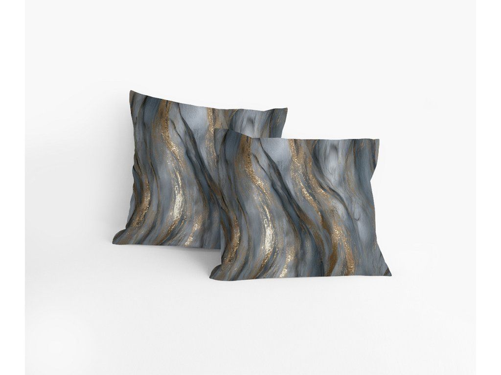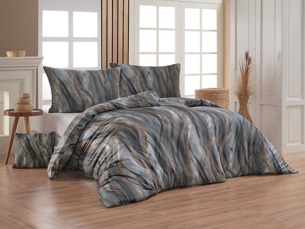 Vzor, který zaujme na první pohled. Stylové povlečení Aretuza s efektním abstraktním motivem připomínajícím strukturu kamene kombinuje bohatou paletu šedých a modrošedých tónů s jemnými zlatavými akcenty. Výsledkem je výrazný, ale zároveň vyvážený design, který dodá vaší ložnici osobitý charakter. Díky nejmodernější digitální tiskové technologii vyniká tento autorský motiv v precizním detailu a celkový nadčasový vzhled podtrhuje decentní lesk prvotřídního bavlněného saténu.