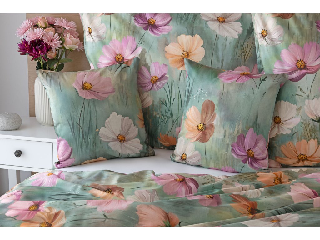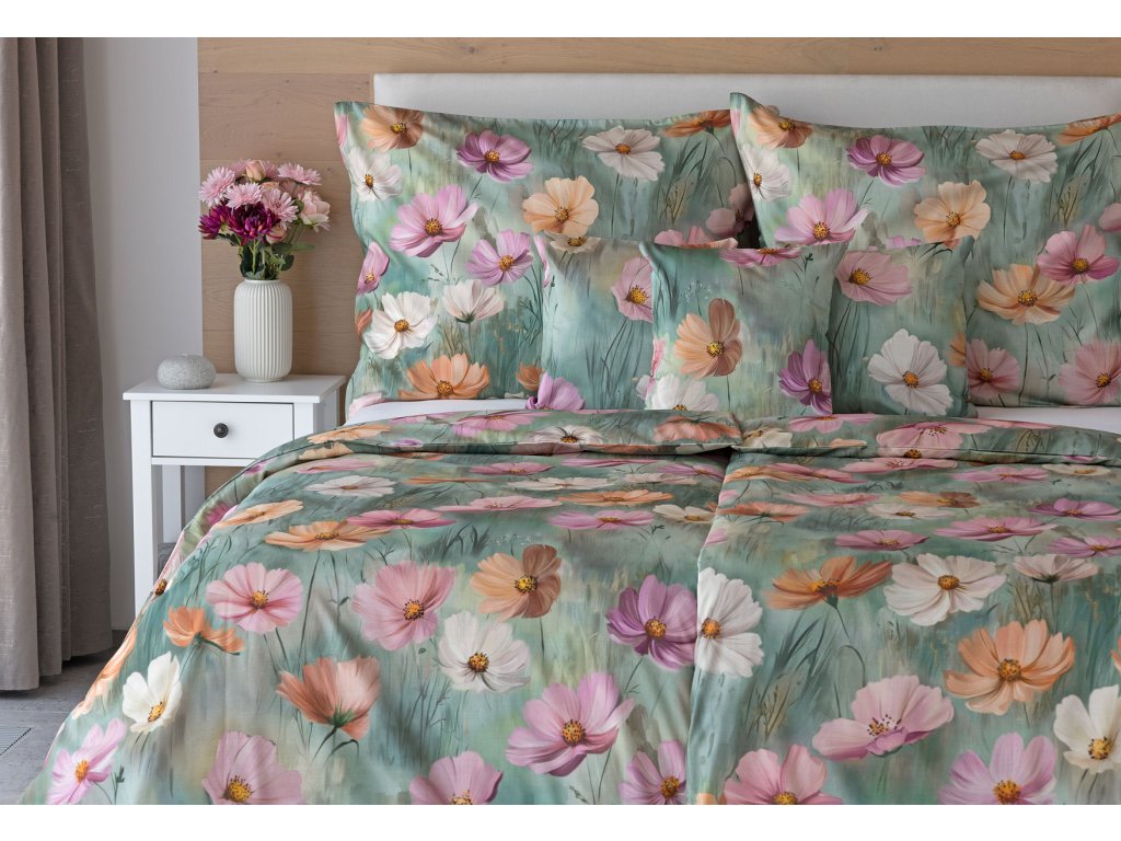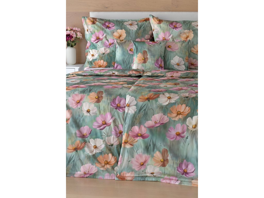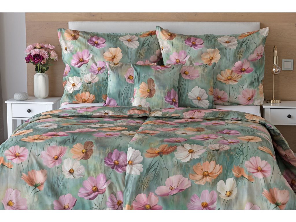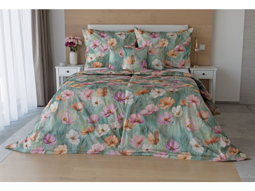 Se saténovým povlečením Elara vaše ložnice rozkvete do krásy. Barevné květy vlčích máků vynikají na modrozeleném podkladu, který přechází v horní části povlečení do tlumeného zelenošedého tónu....