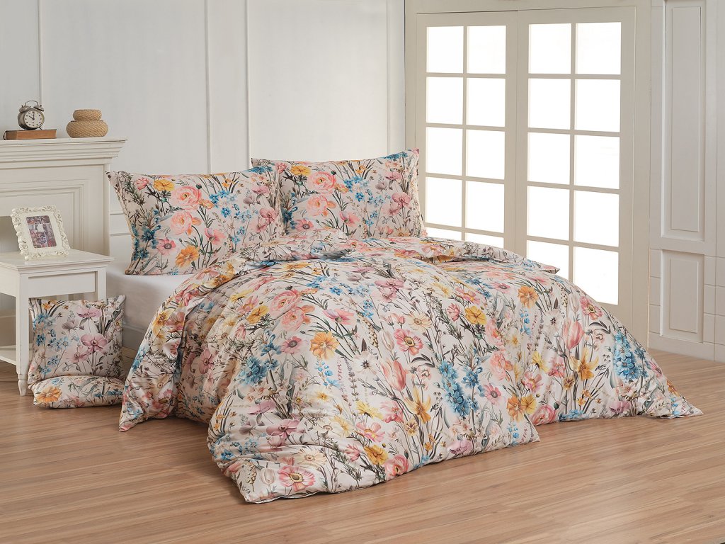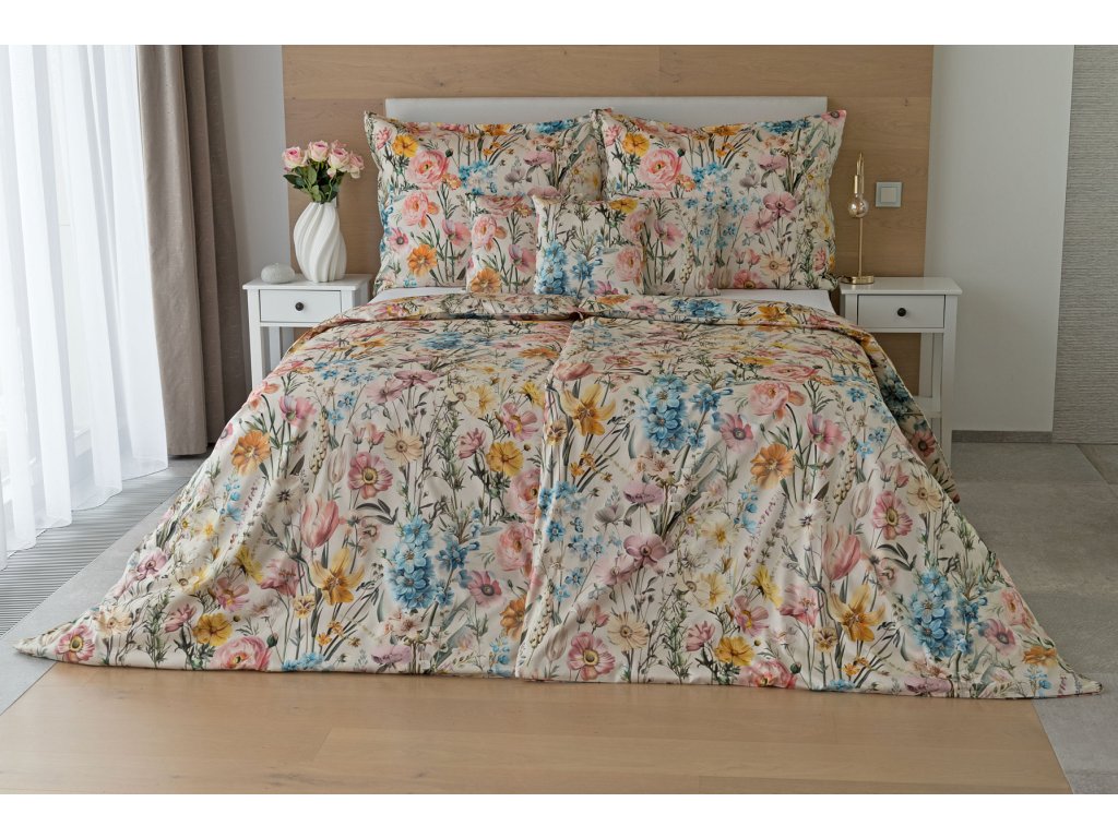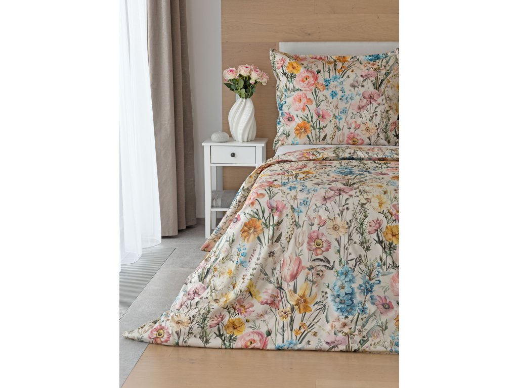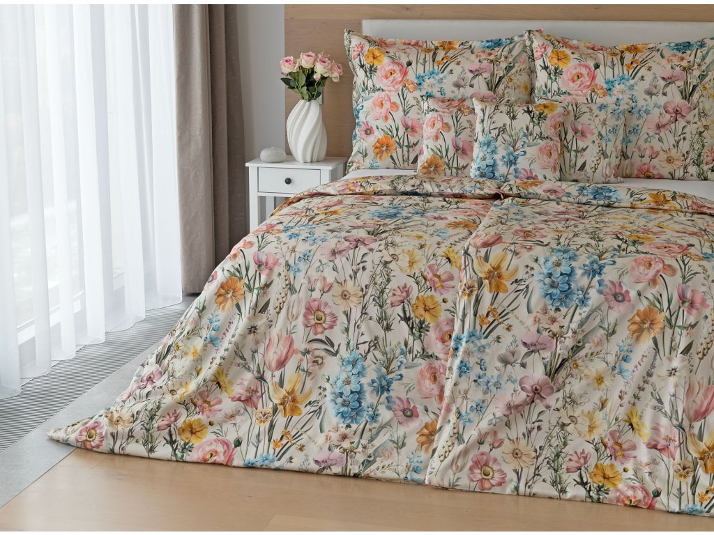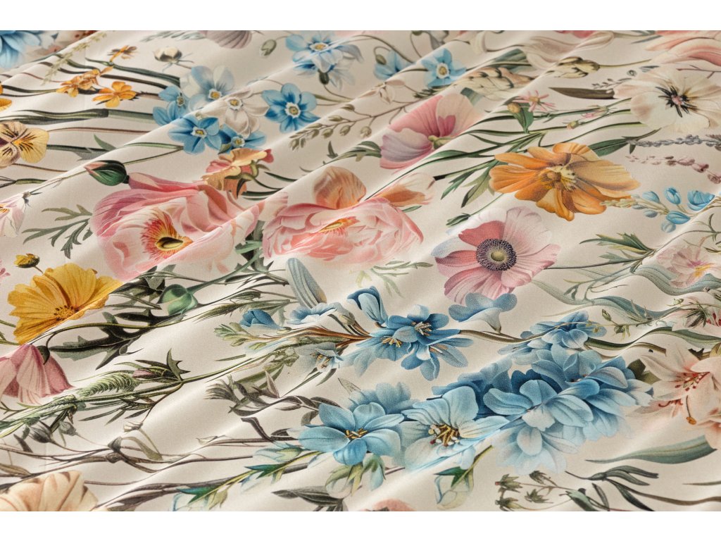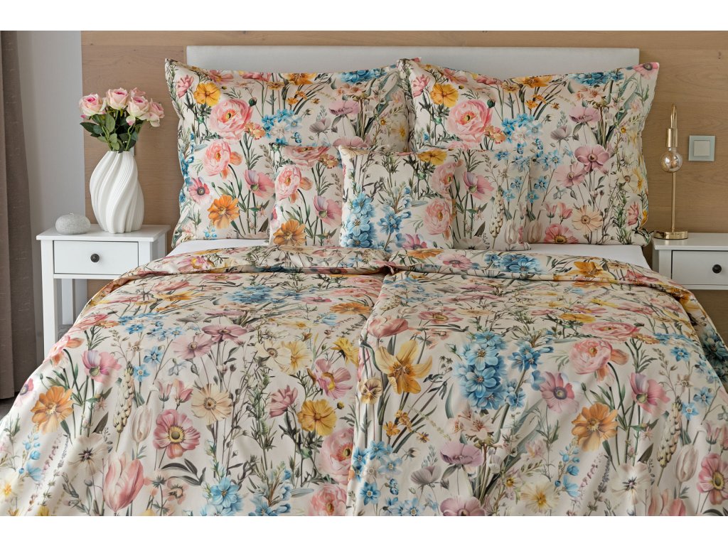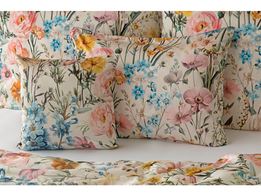 Nechte svou ložnici rozkvést s romantickým povlečením Chantelle. Svěží luční květy v růžových, modrých a žlutých tónech krásně vynikají na krémovém podkladu a díky nejmodernějšímu digitálnímu tisku je florální motiv vykreslen v precizním detailu. Hebký bavlněný satén propůjčuje vzoru decentní lesk a podtrhuje jeho svěží eleganci.
