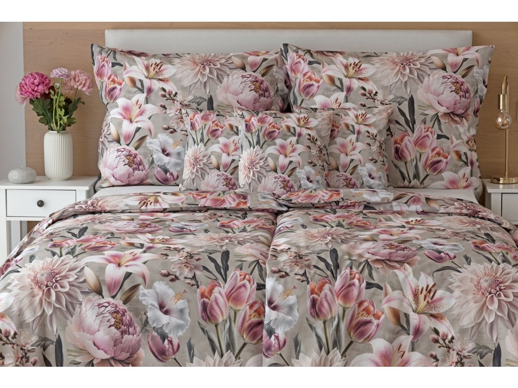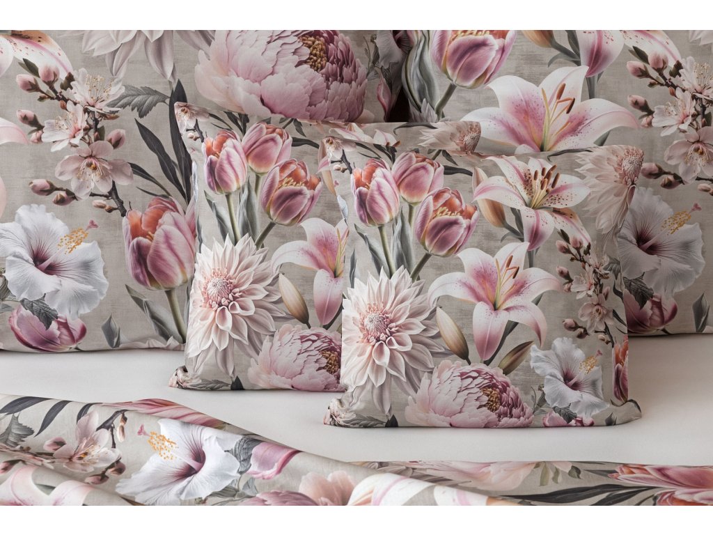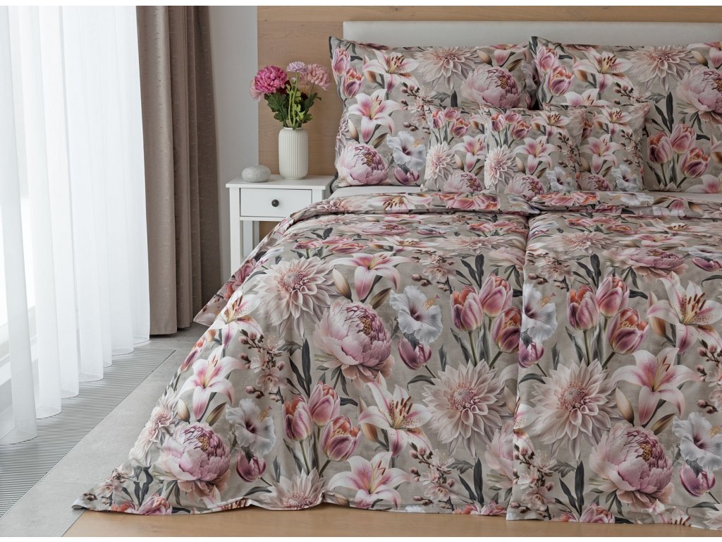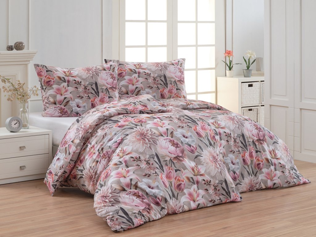 Květinovou symfonii rozehrává bavlněné povlečení Estel, se kterým vaše ložnice zazáří. Pestrobarevné květy na tlumeném světle fialovém podkladu vynikají v precizním detailu díky nejmodernější digitální tiskové technologii.