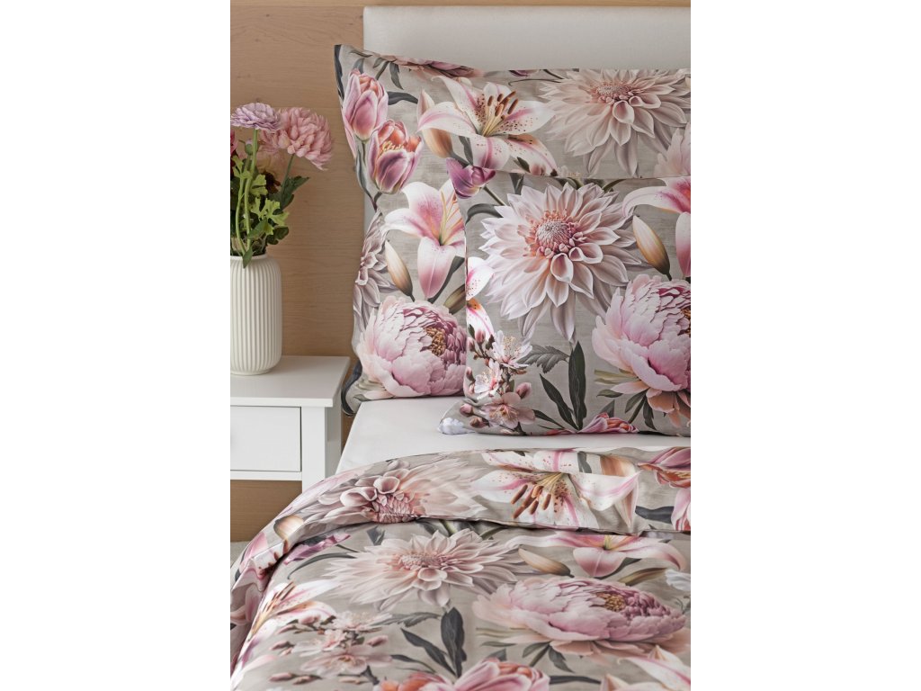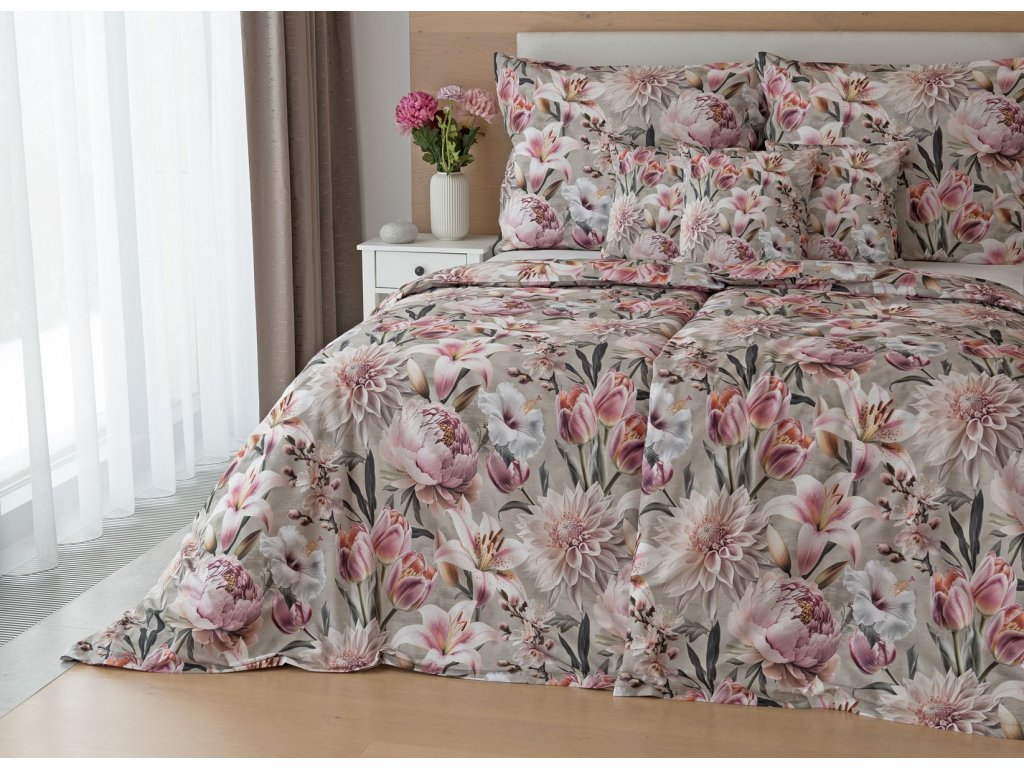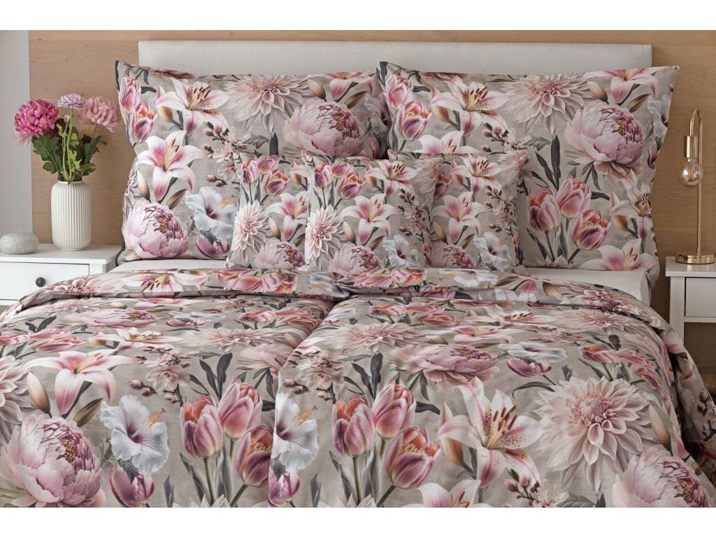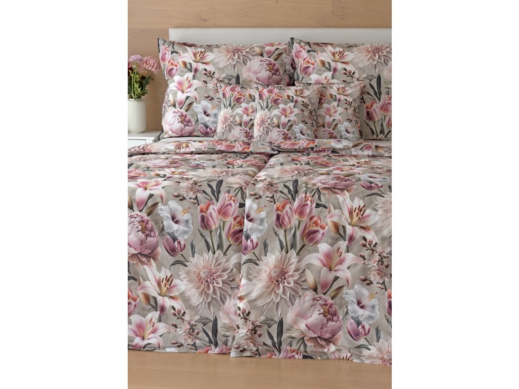 Květinovou symfonii rozehrává bavlněné povlečení Estel, se kterým vaše ložnice zazáří. Pestrobarevné květy na tlumeném světle fialovém podkladu vynikají v precizním detailu díky nejmodernější digitální tiskové technologii.