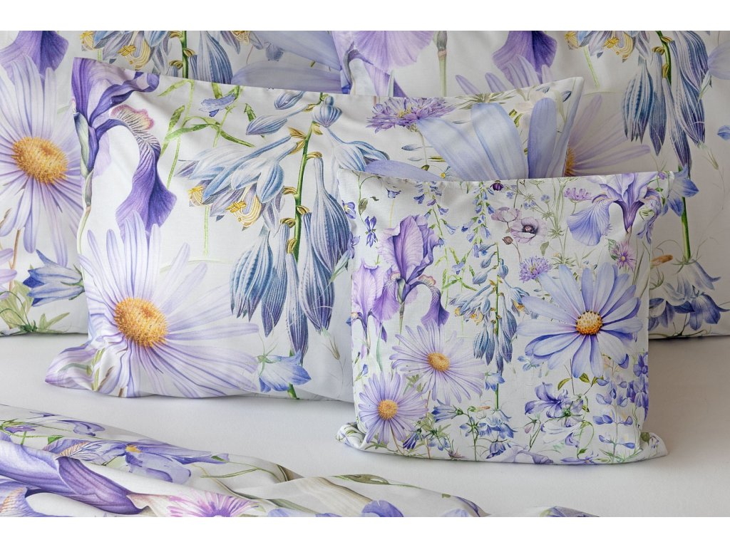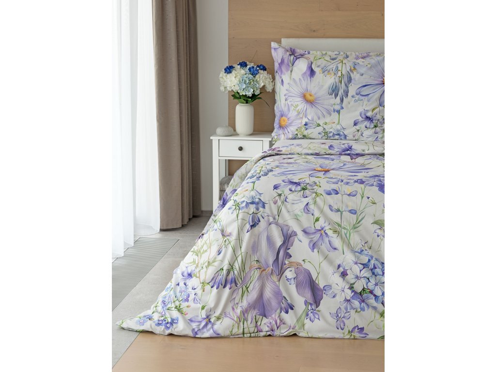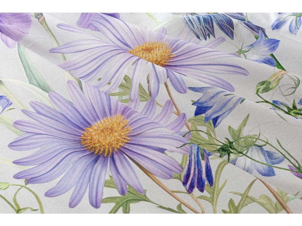 Okouzlující květinové povlečení Mirabel vnese do vaší ložnice nádech svěžesti. Květy kosatců, lučních zvonků, pomněnek i kopretin jsou v návrhu sladěny do atraktivní palety fialových a světle modrých tónů, které působí uklidňujícím a hřejivým dojmem. Díky nejmodernějšímu digitálnímu tisku vyniká florální motiv v precizním detailu.