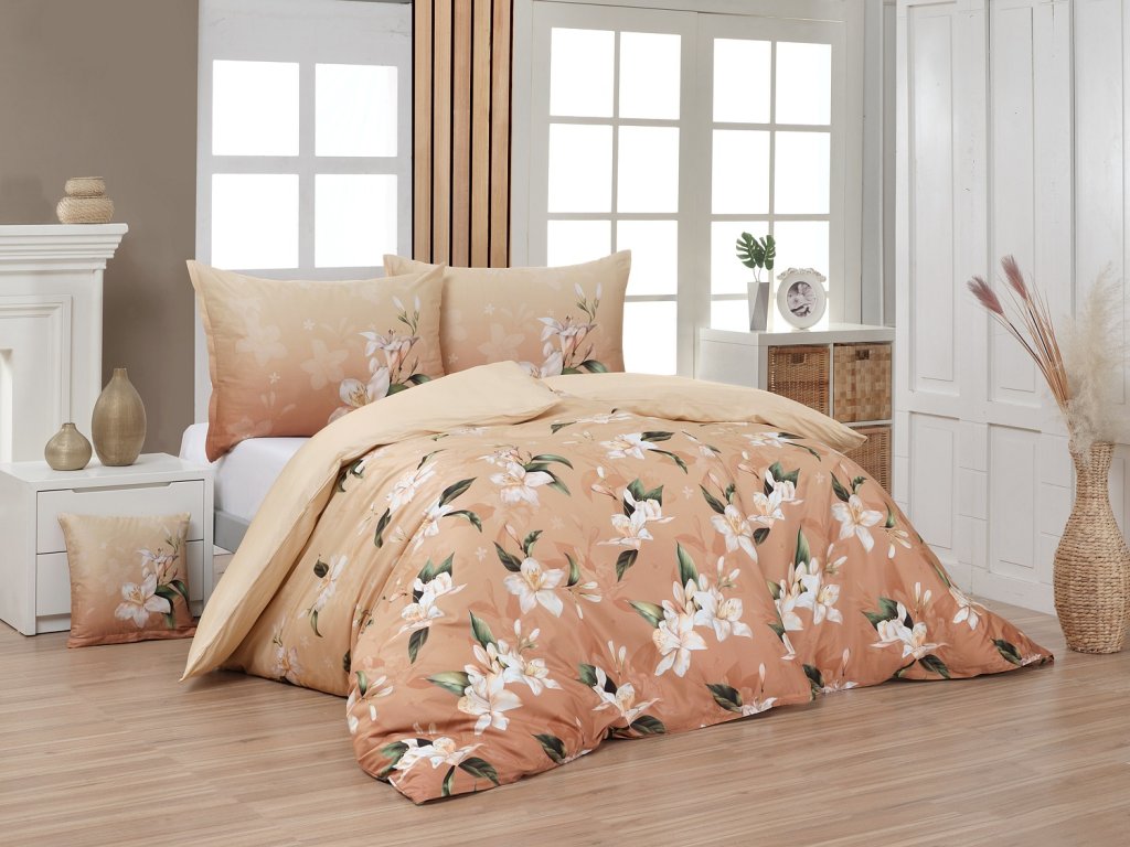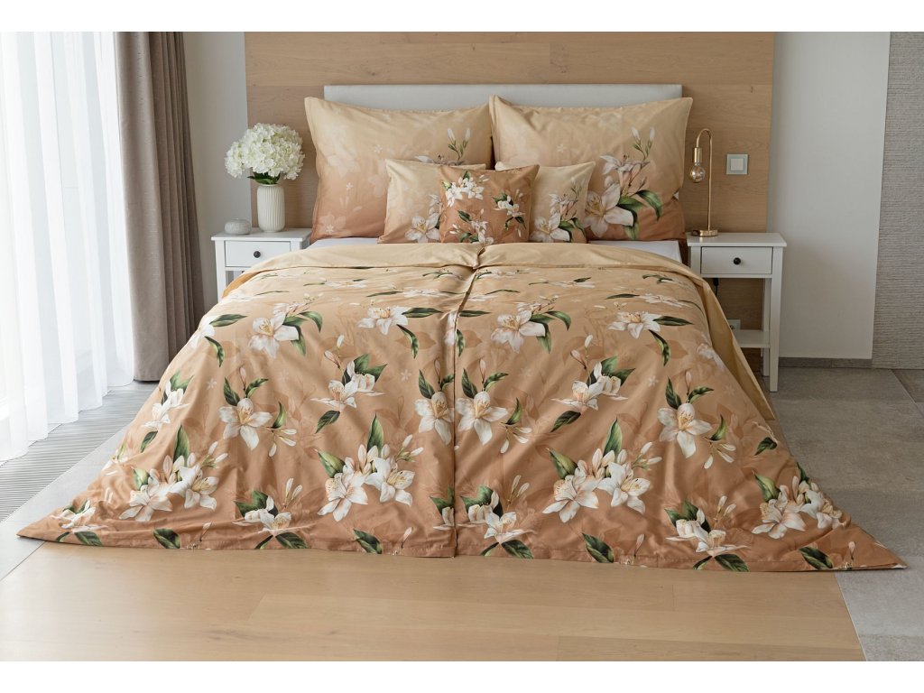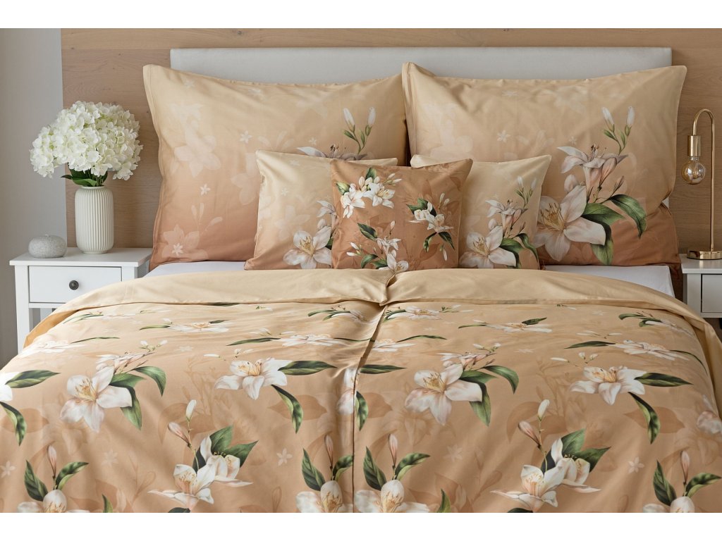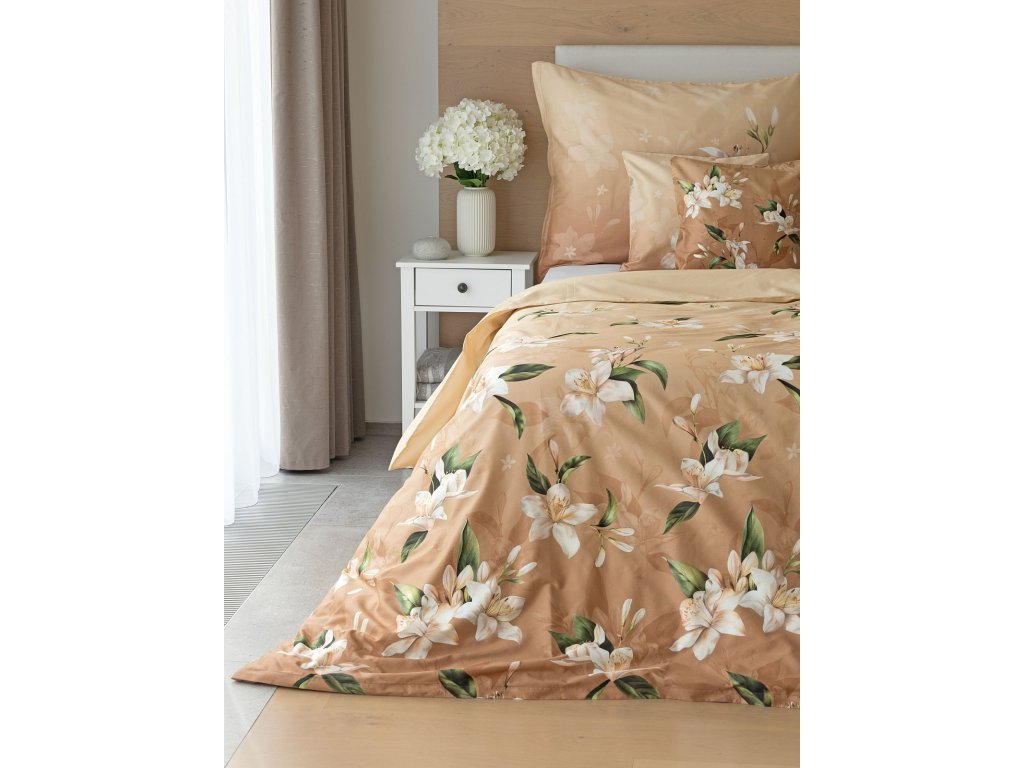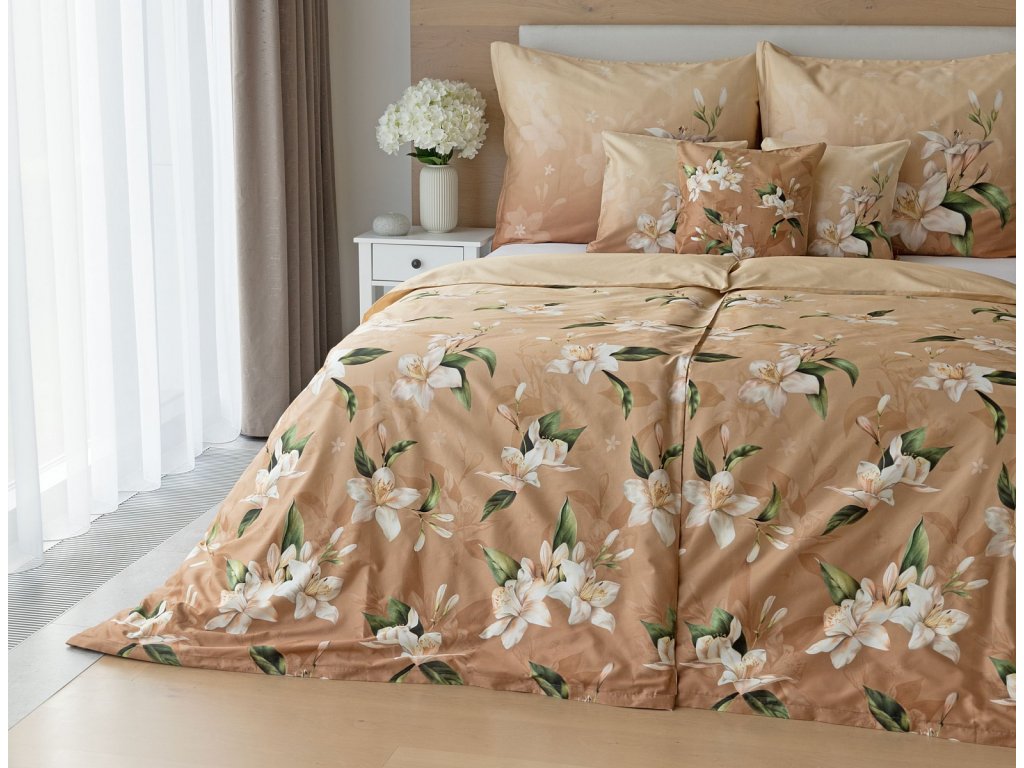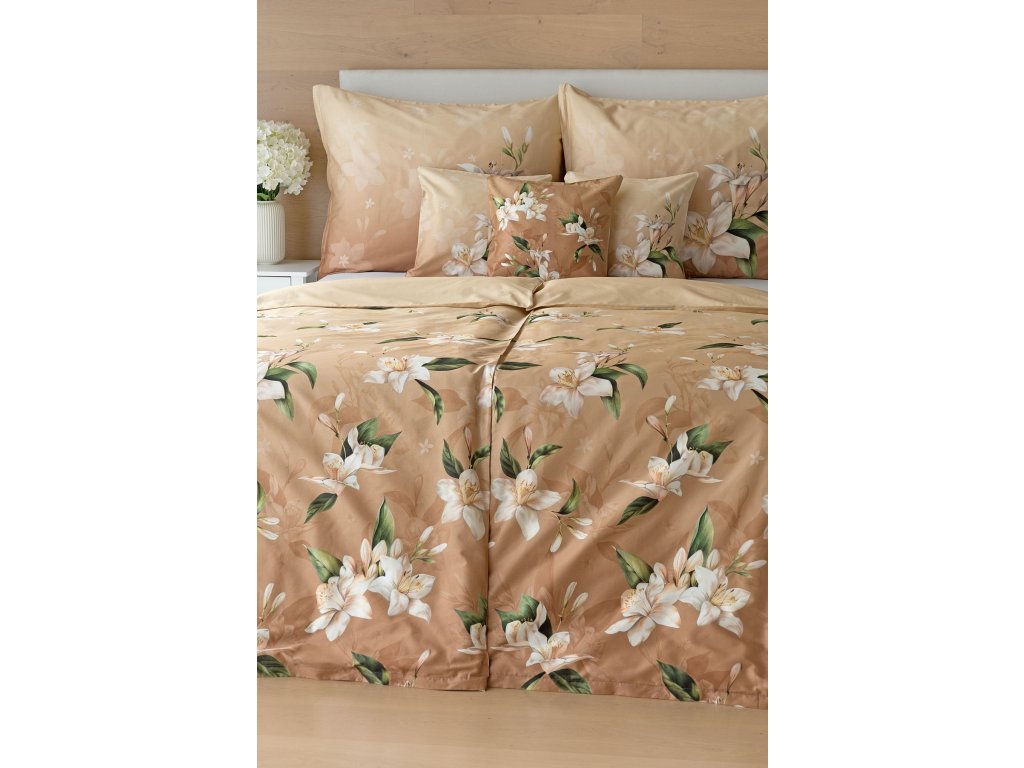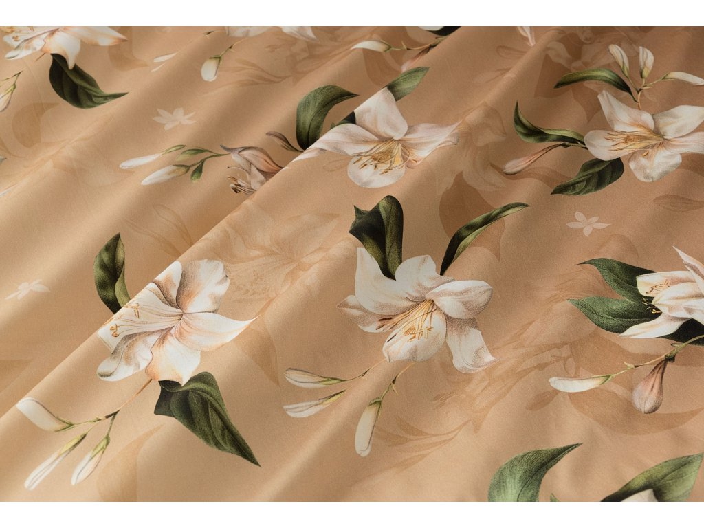 Saténové povlečení Nova s okouzlujícím motivem bílých lilií se stane elegantní ozdobou každého interiéru.