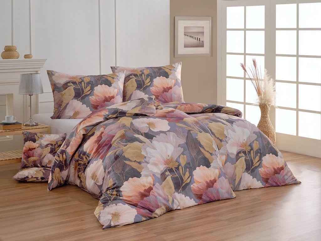 Ložní povlečení Veneto zdobí výrazný květinový motiv s tlumeným podkladem v šedo-fialových tónech. Velkoryse pojaté abstraktní květy v paletě pudrových, meruňkových, korálových a fialových tónů doplňují zlatavé prvky, které podtrhují elegantní vzhled tohoto originálního vzoru. Decentní lesk bavlněného saténu je poslední tečkou k dokonalosti tohoto povlečení.