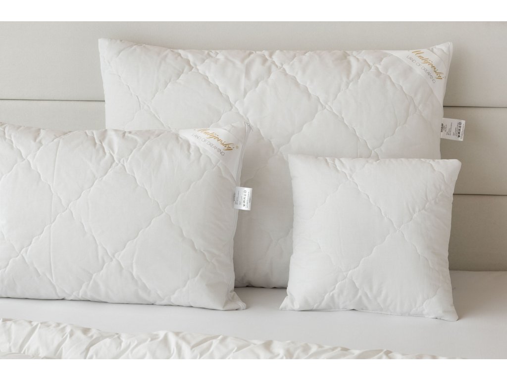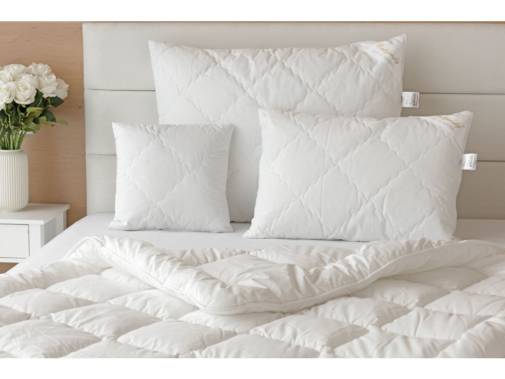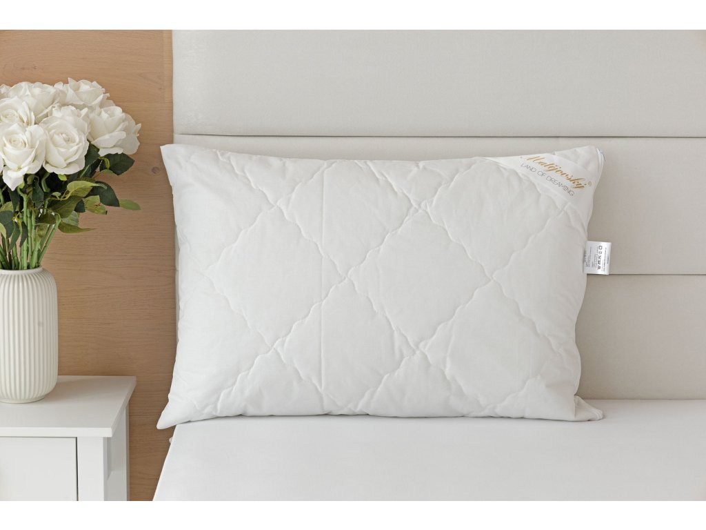 Díky použití odolných materiálů zůstávají polštáře nadýchané a tvarově stálé i po opakovaném praní při vysoké teplotě. Potah z broušeného mikrovlákna s příměsí bavlny je prodyšný a dobře absorbuje vlhkost. Vnitřní výplň polštáře tvoří duté kuličkové vlákno, které je pružné a nesléhá. U větších polštářů lze regulovat objem přidáním či odebráním kuličkové výplně.